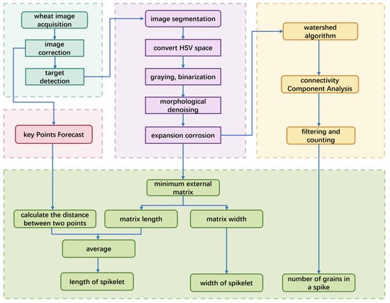 The wide application of image processing technology in the field of agriculture provides an important means for crop monitoring, especially in the direction of crop classification and segmentation, fruit ripeness grading, and so on, to harvest many results []. In the recognition of multiple phenotypic parameters of soybean seeds, multiple phenotypic trait parameters such as the number of soybean seeds, long axis length, short axis length, area, circumference, etc., were calculated based on the OpenCV image processing library, realizing the automatic acquisition of phenotypic parameters at low cost and high throughput []; when determining the thousand-kernel weight of rapeseed grains, the limit corrosion algorithm was combined with the distance transformation and other operations so that the relative measurement error of the three varieties did not exceed 3.16% []. In the field of wheat spike feature extraction, the morphological method realizes the automated extraction of indicators such as the number of awns, awn length, spike length, spike type, and so on [,]; fusing the image processing algorithm with the YOLOv7 deep learning algorithm, the accuracy of wheat seed counting can reach 99.16% []; extracting the number of grains in a wheat spike through image processing and a deep learning algorithm, the accuracy reaches 92.04% []. These studies break the bottleneck of traditional manual monitoring efficiency, quantitatively correlate image features with crop phenotypes, promote the transformation of agricultural decision-making from experience-driven to data-driven, and inject new kinetic energy into the development of smart agriculture.