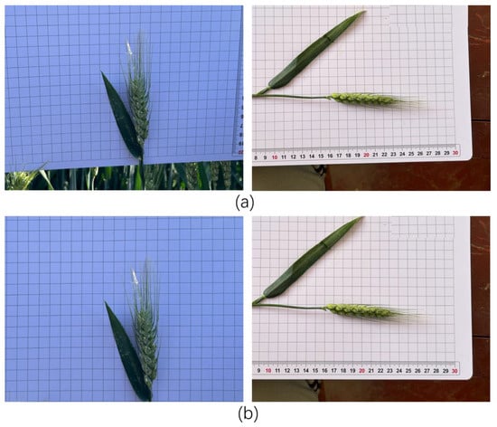 As one of the world’s three major grains, wheat is the main source of food for many countries and regions around the world. In China, wheat is the second largest grain crop, with a total planting area of approximately 23.07 million hectares in 2025 and a yield accounting for 19.80% of the total grain production, which is of great significance for ensuring global food supply. Therefore, as a global key food crop, wheat yield and quality directly affect food security and agricultural economic development [,]. The production capacity of a single wheat plant is the core system of wheat production capacity [], and spike phenotypic parameters such as spike length, spike width, and number of grains in the spike are closely related to the production capacity of a single plant [,,]. These parameters are not only the key indicators for evaluating the merit of wheat varieties, but also are important data that provide support for precision breeding and field management []. The scientific and accurate collection and analysis of wheat spike phenotypic traits helps to screen high-yielding and high-quality varieties, monitor crop growth differences in the field, provide data guarantee for building intelligent planting modes, and promote the development of the wheat industry in a more precise and efficient direction [].