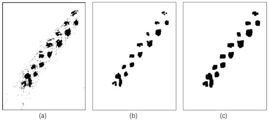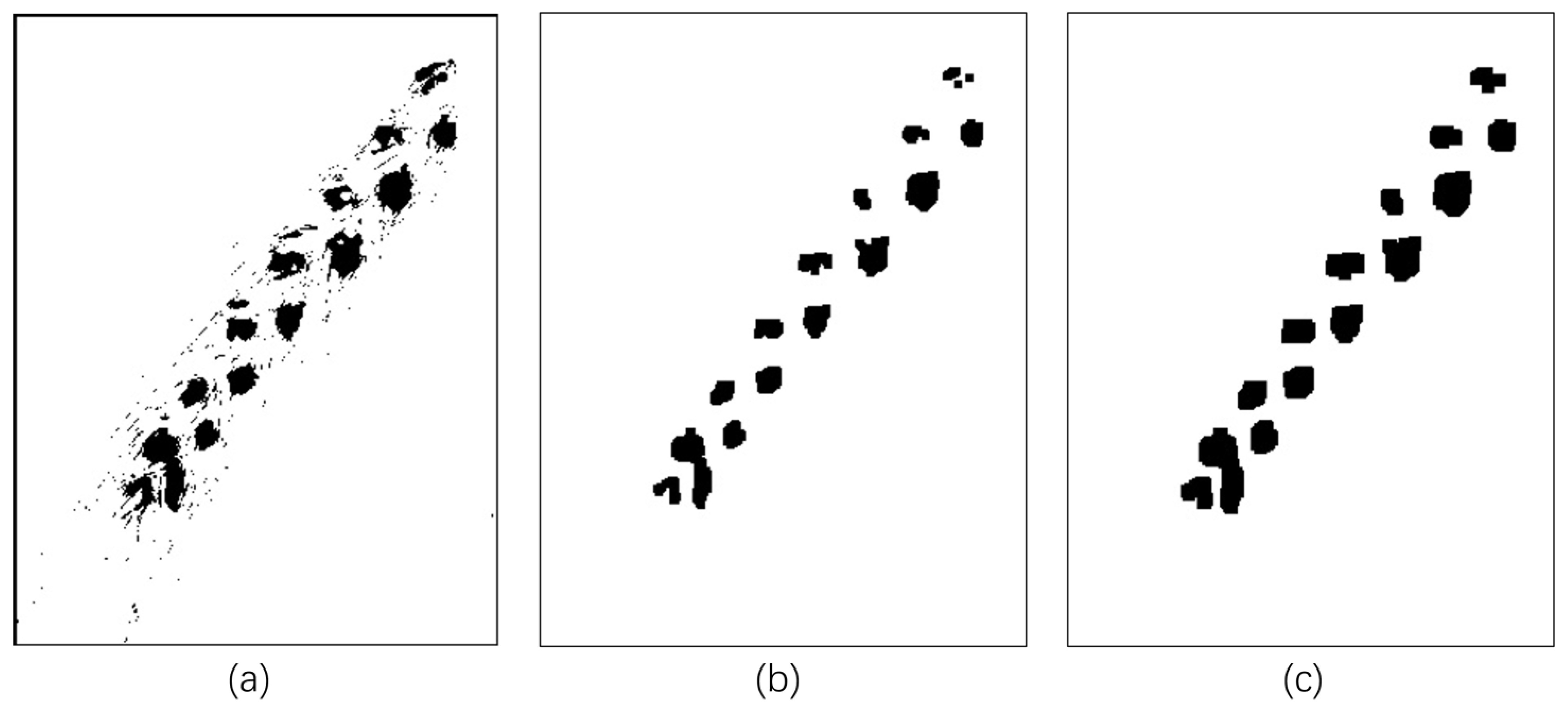 Images after morphological manipulation. (a) Grayed-out binarized image; (b) morphological denoised image; (c) morphological swollen corrosion image.