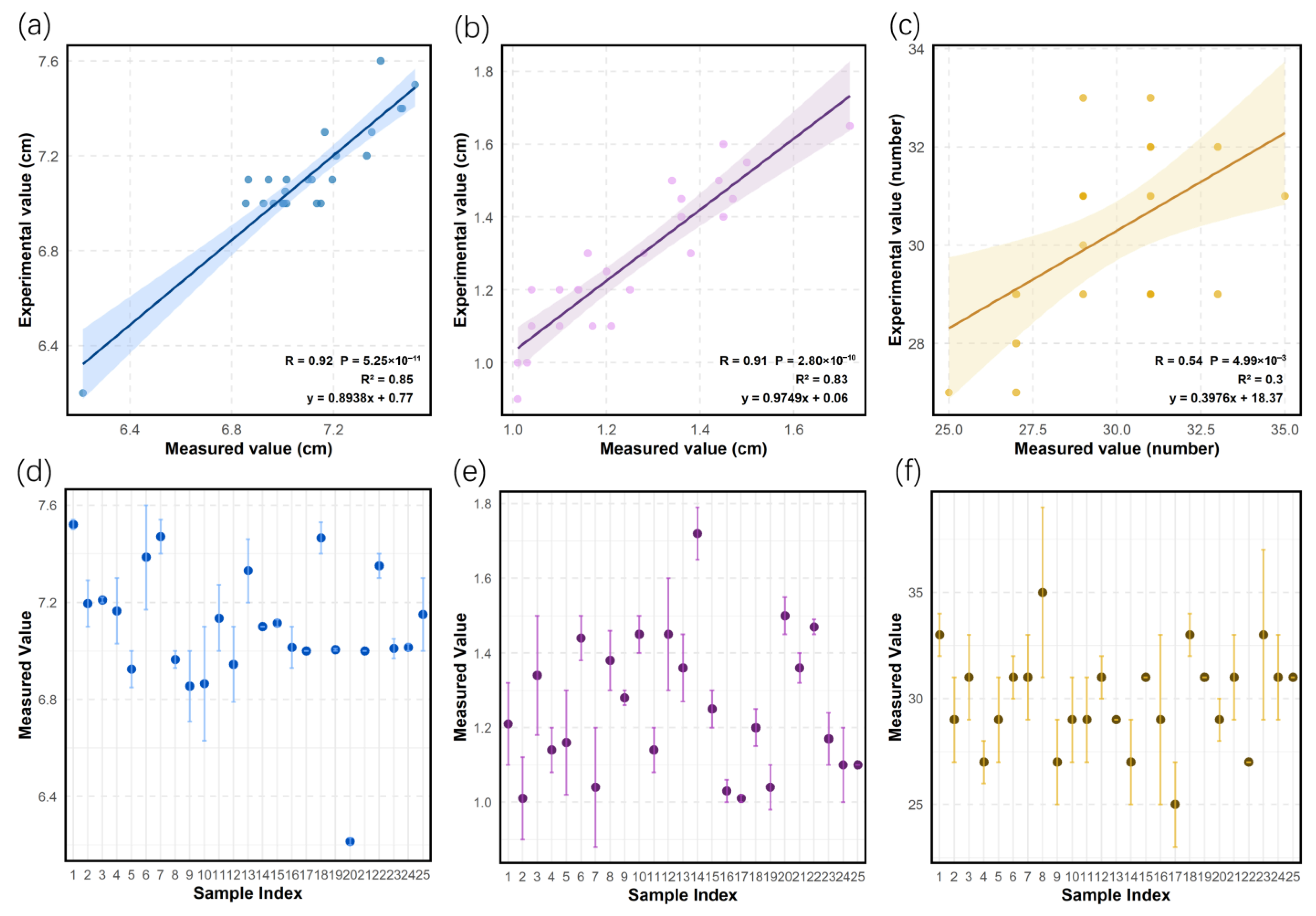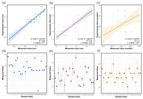 Result analysis plots. (a) Spike length regression analysis; (b) spike width regression analysis; (c) spike grain number regression analysis; (d) spike length error analysis; (e) spike width error analysis; (f) spike grain number error analysis.
