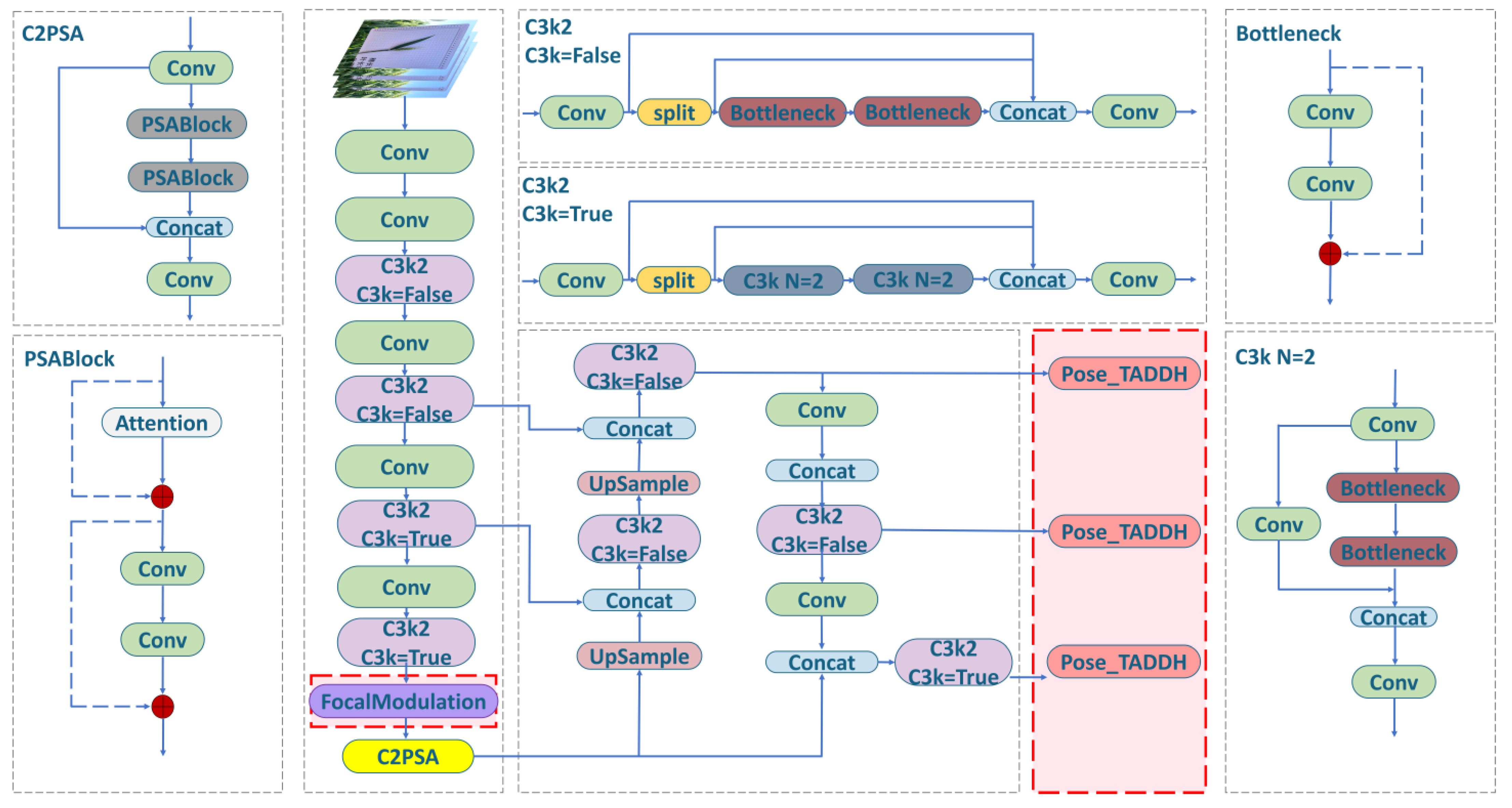 Aiming at the problems of misdetection and insufficient detection accuracy of keypoints caused by light interference and occlusion in the field environment, the study builds a neural network model by integrating FocalModulation and TADDH (Task-aligned Dynamic Deformable Head) modules based on YOLOv11-pose. The FocalModulation module strengthens the model’s global perception and contextual modeling of key point features through the interactive modulation of space, channel, and task, and improves the ability of occluded region recognition; the TADDH module adds the Pose_TADDH detection head while guaranteeing the detection accuracy, realizing the independent modeling and spatial decoding of key point information, and enhancing the model’s ability to characterize complex structures and multi-scale targets. The dual modules work together to effectively improve the modeling level and anti-obstruction robustness of the model to the target structure information, improve the key point detection accuracy in complex scenes, and build a solid technical foundation for intelligent phenotyping of wheat, and the improved network structure is shown in Figure 5.