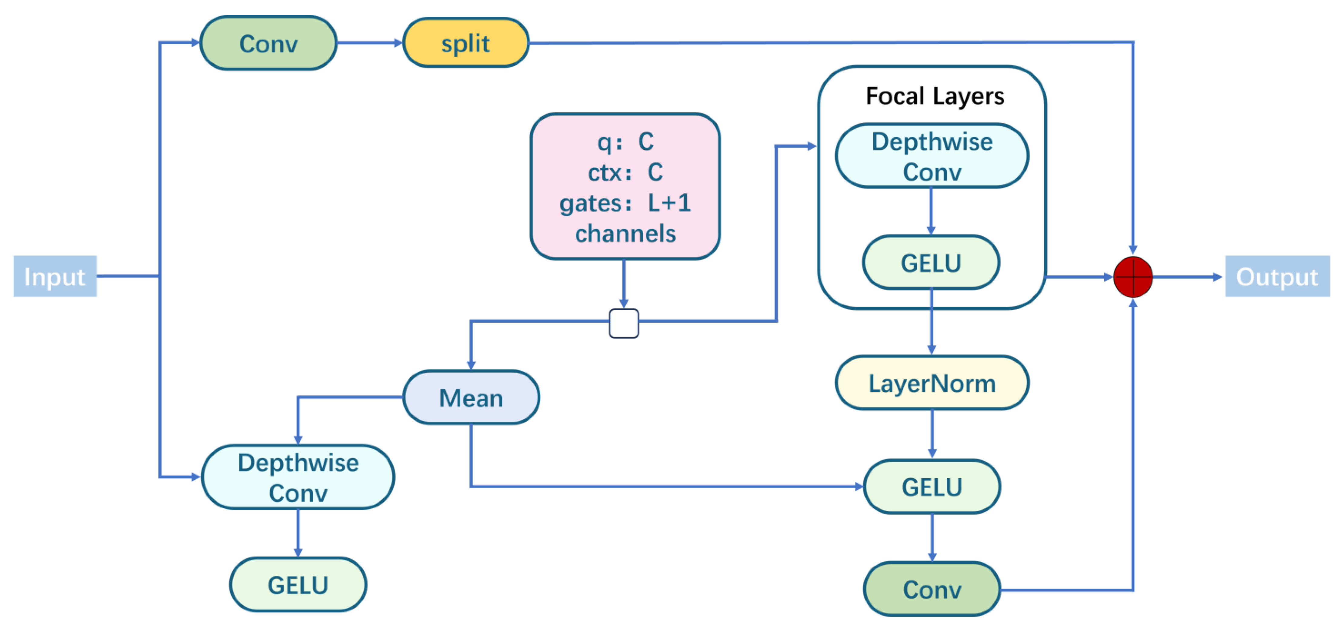 This paper introduces a focal modulation mechanism on high-level semantic feature maps and constructs a FocalModulation module to boost the model’s ability to model contextual information at various scales. The module combines the local fine-grained receptive field with global contextual attention for enhanced spatial perception and expression. It splits the input feature x into query (q), context (ctx), and gating vectors (gates) via 1 × 1 convolution. q and ctx have the same dimension, with gates controlling the focus layer’s output weight. Ctx undergoes depth-separable convolution for multi-scale aggregation, and its receptive field is adjusted by local_window and local_factor to balance local and remote information. Ctx_global is processed by global average pooling for long-range context. Context features are gated, weighted, and modulated with q channel-by-channel. To improve stability, the module offers normalization options and outputs optimized features via linear projection, as depicted in Figure 6.