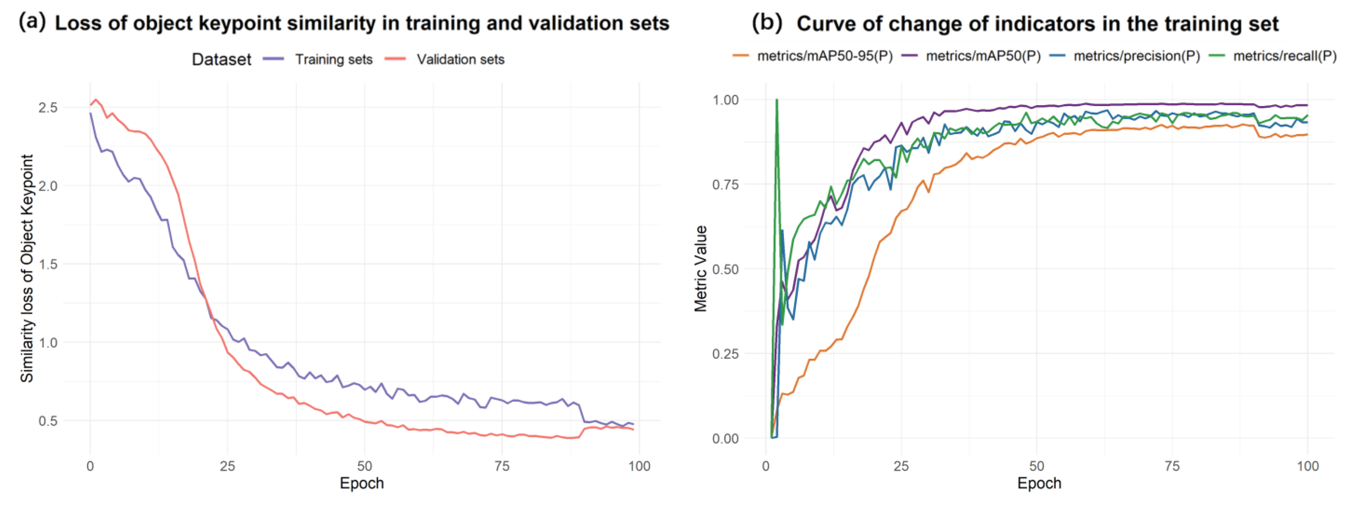For the target keypoint detection task, a deep neural network model is constructed and evaluated systematically using a hyperbolic analysis framework. Figure 8a shows that the keypoint similarity loss between the training and validation sets decreases during training and converges after about 50 epochs, demonstrating the model’s good fitting ability for wheat ear keypoints (spike apex and base). In Figure 8b, metrics like mAP@0.5, mAP@0.5:0.95, Precision, and Recall improve after 20 epochs, converge around 50 epochs, and the mAP approaches 0.95. This indicates the model performs well in keypoint detection, with high accuracy, robustness, and an ideal training effect without significant overfitting.