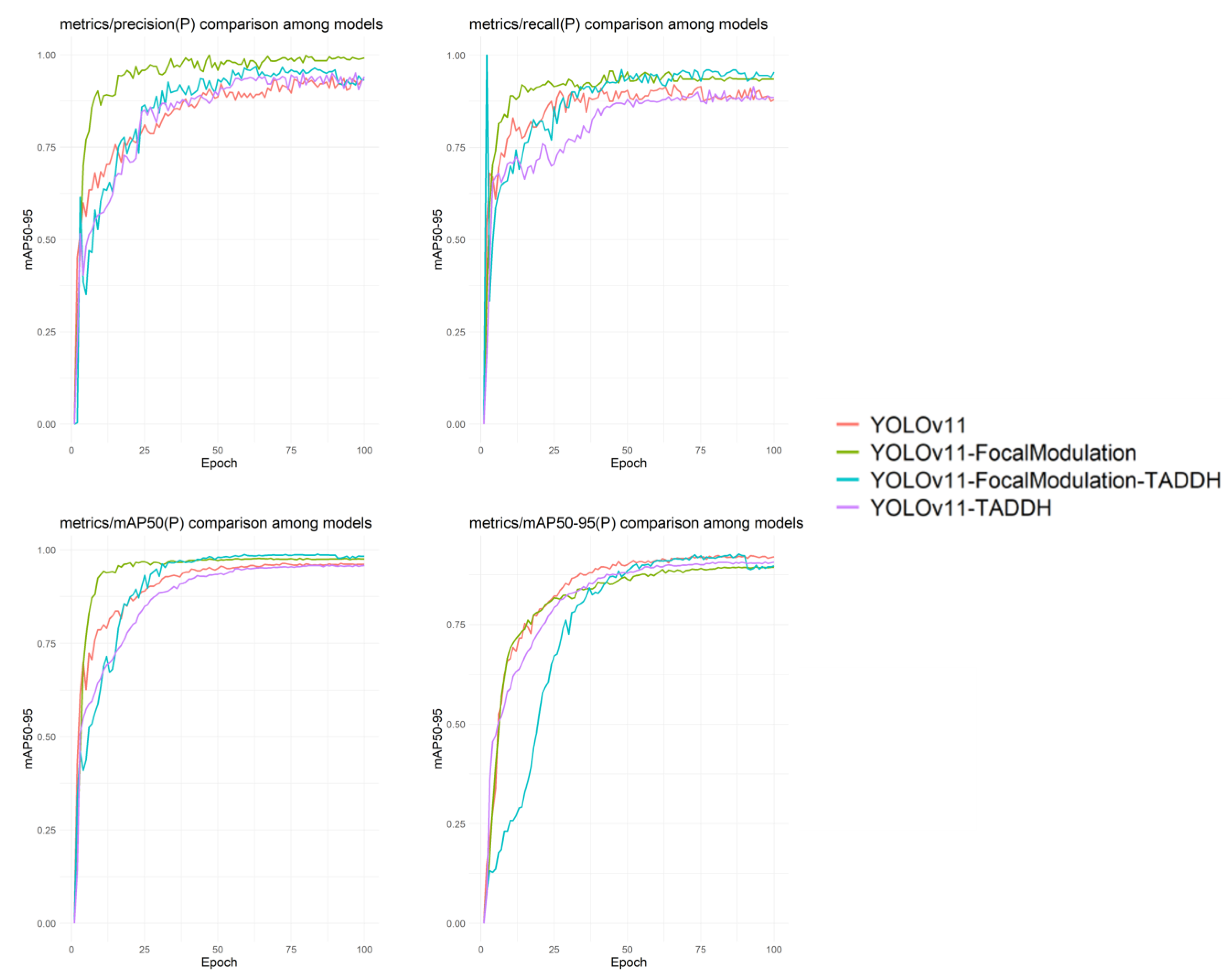 To verify the impact of different module designs on model performance, multiple sets of experiments were conducted, and the results are presented in Table 2. All models use the same dataset and training strategy, with evaluation based on the validation set. YOLOv11 shows balanced performance: Precision at 89.40%, Recall at 89.50%, mAP50 at 95.90%, mAP50-95 at 91.60%, and a detection time of 41.20 ms. Adding the FocalModulation module boosts Precision by 9.00% but reduces mAP50-95 by 2.30%. The TADDH module improves both metrics but increases detection time to 62.70 ms. However, fusing the two modules achieves higher precision: Precision reaches 96.00%, Recall 95.00%, mAP50 98.70%, mAP50-95 92.60%, and the model size is only 4.80M, indicating significant performance enhancement. Model comparison results are shown in Figure 9.