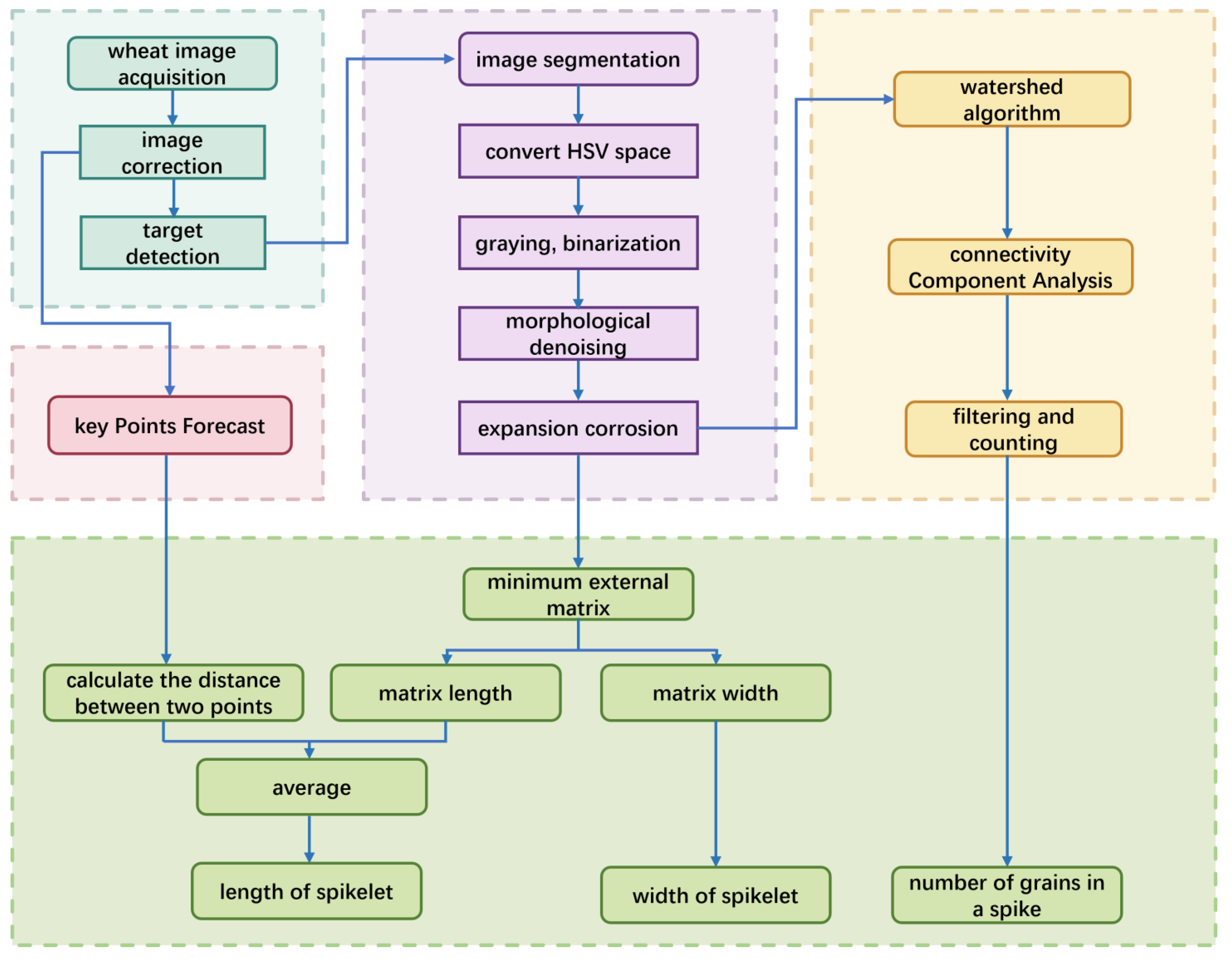 Aiming at the problems of low efficiency and large error of the traditional manual measurement of spike phenotype, this paper explores integrating YOLOv11 keypoint detection with image processing to create an automated extraction system. The system preprocesses field wheat spike images using aberration correction and perspective transformation, then applies the YOLOv11 model for precise spike positioning and instance segmentation. Leveraging morphological features and deep learning, it automatically extracts and analyzes phenotypic parameters like spike length, width, and grain number, enhancing measurement efficiency and accuracy. The overall workflow is illustrated in Figure 11.