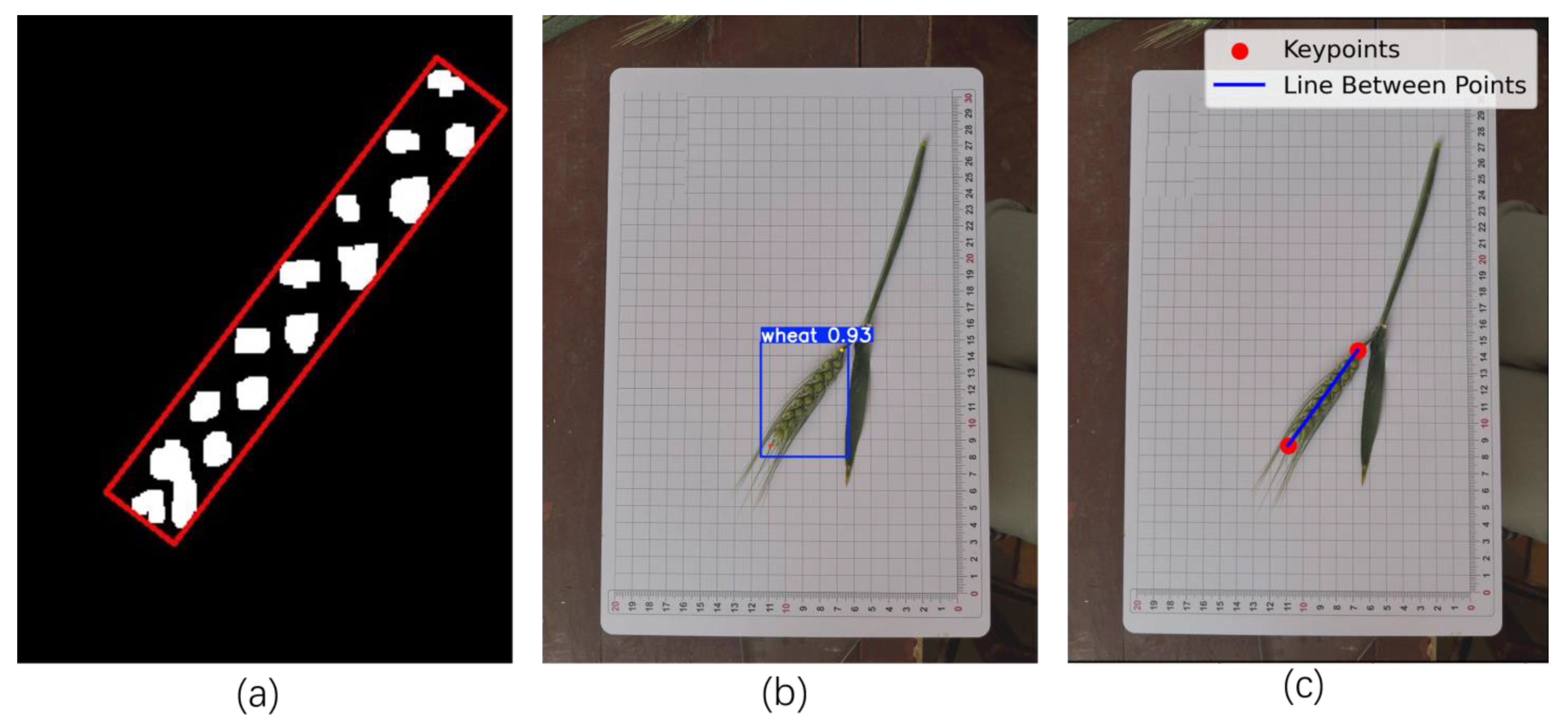 Spike length and width extracted image. (a) Minimum outer join matrix; (b) key point detection; (c) distance calculation between two points.