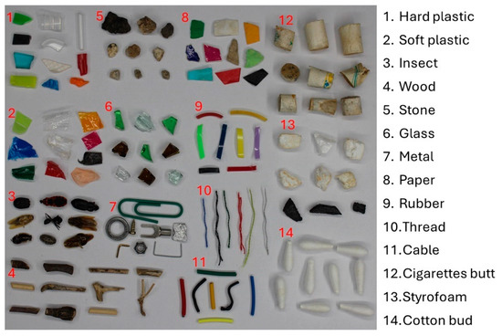 In addition, various types of FMs differing in shape, size, and color commonly found in fresh-cut vegetables, such as plastics [39], insects [40], stones [41], and wood pieces [42], were prepared to simulate realistic contamination scenarios. Additional FM categories that may potentially occur in fresh-cut vegetable processing were also included to enhance the model’s capacity to recognize and generalize across a wider range of FM types. Two distinct FM groups, designated as FM-1 and FM-2, were utilized in this study. FM-1 comprised 14 categories of FMs and was employed to construct the primary dataset, whereas FM-2 contained a separate collection of FM that differed in geometry, size, and color characteristics from those in FM-1. The fourteen FM categories typically found in fresh-cut vegetables are illustrated in Figure 1 and their physical dimensions are listed in Table 2. All experimental procedures and data collection activities were carried out between June 2023 and February 2024.