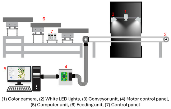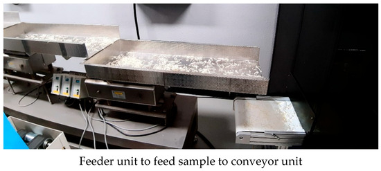 The inspection system for detecting FMs in fresh-cut vegetables comprised three main units: a feeder unit, a conveyor unit, and a sensor unit, as illustrated in Figure 2. The feeder unit (318 cm × 60 cm × 116 cm) delivered vegetable samples onto a conveyor belt driven by a digital frequency controller. It consisted of three trays of equal length, but varying widths (30 cm, 35 cm, and 40 cm) arranged from top to bottom to facilitate uniform distribution of samples. The conveyor unit (150 cm × 30 cm × 35 cm) was powered by a stepper motor (Nema 23, Series E, Jiangsu Novotech Electronic Technology Co., Ltd., Wuxi, China) connected to a motion controller board (TB6600 stepper motor driver with Raspberry Pi 4 Model B, Egoman Technology Co., Ltd., Shenzhen, China). The sensor unit consisted of a 5-megapixel USB 3.0 CMOS color camera (MV-CA050-20UC, Hikvision, Hangzhou, China) equipped with a C-mount lens (focal length = 8 mm, aperture = 1:1.4). The camera was calibrated using a color checker (Spyder Checkr® 24, Datacolor Technology Co., Ltd., Suzhou, China) supported by SpyderCHECKR 1.6 software. It was mounted 30 cm above the conveyor surface and flanked by two white LED lamps (JKLEDT5 60, 10 W, Kwangmin Lighting Co., Ltd., Incheon, Republic of Korea) positioned in parallel at a height of 15 cm and spaced 35 cm apart. The LED lighting arrangement (6500K, daylight type) was verified before each test to ensure stable light intensity (1200% lux) using a calibrated lux meter (Fluke 941 Light Meter, Fluke, Daegu, Republic of Korea). The linear speed of the conveyor belt was periodically measured with a laser tachometer (Lutron DT-2236C, Lutron, Shenzhen, China) and adjusted to maintain a tolerance of ±1%. Both the camera and lighting assembly were enclosed within a dark chamber to eliminate ambient light interference.