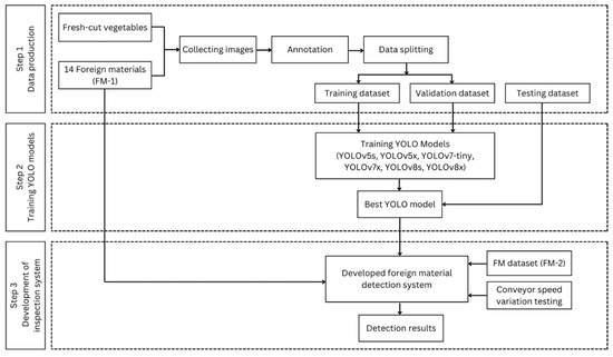 The best-performing YOLO model in .pt format was loaded into the GUI using PyTorch and seamlessly integrated with OpenCV. OpenCV was employed to process the data buffer from the industrial camera, breaking it down into individual frames and reassembling them into a real-time display within the GUI. This enabled the online identification of FMs in fresh-cut vegetables. Additionally, the GUI was integrated with the unit conveyor system using an HTTP client-server protocol, allowing control of the stepper motor driver connected to a Raspberry Pi. Subsequently, the best YOLO model was validated using FM-1 and FM-2 datasets under real-time conditions. The FM-1 evaluation investigated the model’s performance in identifying FMs in each FM category. At the same time, the FM-2 evaluation focused on the model’s ability to detect objects that have never been recognized during the training of the model. A critical assessment involved calculating the detection rate by comparing the number of successfully detected FMs against the total number of objects introduced. The model’s reliability in detecting FMs was also tested at varying conveyor speeds to determine the optimal operational speed; high, medium, and low speeds of 69.88, 36.73, and 18.40 cm/s were considered. The methodology and stages of this evaluation are depicted in Figure 3.