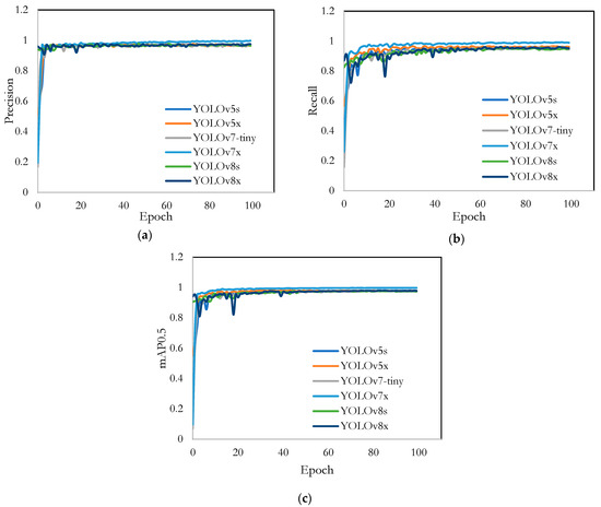 Training results of different YOLO models: (a) precision; (b) recall; and (c) mAP0.5.