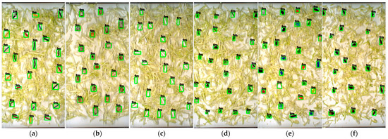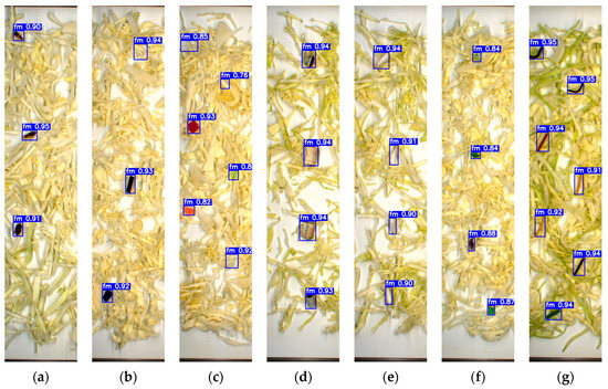 Table 5 shows that the YOLOv7x model outperformed the other models in terms of precision, recall, and mAP@0.5, suggesting superior detection capabilities. Specifically, the precision of the YOLOv7x model was 99.80%, which was 3.10%, 3.00%, 3.60%, 3.10%, and 3.00% higher than that of the YOLOv5s, YOLOv5x, YOLOv7-tiny, YOLOv8s, and YOLOv8x models, respectively. A high precision indicated that the model was likely to be accurate when detecting FMs in fresh-cut vegetables. Moreover, the YOLOv7x model achieved a recall of 99.00%, which was 3.10%, 4.00%, 3.30%, 3.80%, and 3.30% higher than the YOLOv5s, YOLOv5x, YOLOv7-tiny, YOLOv8s, and YOLOv7x models, respectively. A high recall meant that the model was excellent at detecting FMs.