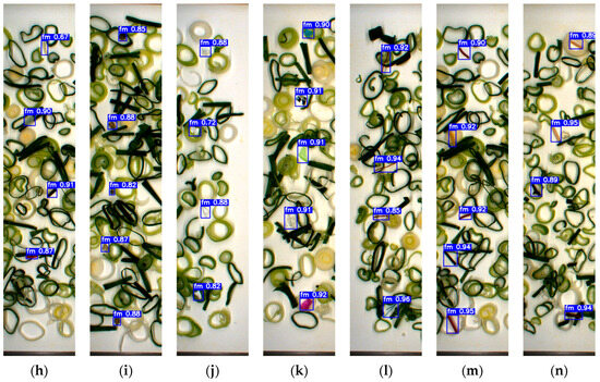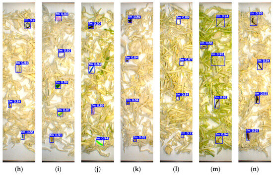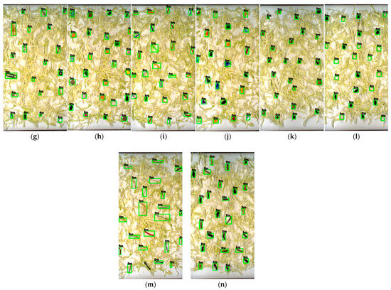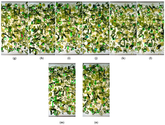 Detection results based on the testing dataset of cabbage: (a) insects; (b) hard plastic; (c) tiny plastic; (d) cigarette butt; (e) cotton bud; (f) glass; (g) cable; (h) metal; (i) paper; (j) rubber; (k) stone; (l) Styrofoam; (m) thread; (n) wood.