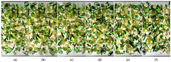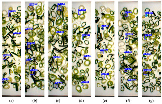 The robustness of the YOLOv7x model was evaluated under real-time conditions using a separate set of FMs (FM-2) that were not included in the training dataset. This evaluation aimed to examine the model’s generalization capability in detecting previously unseen objects with varying shapes, sizes, and colors across different vegetable matrices. A total of 247 FMs were randomly introduced into cabbage and green onion samples. As presented in Table 8, the YOLOv7x model achieved a detection accuracy of 99.18% for cabbage and 98.40% for green onion, confirming its ability to identify and classify objects not encountered during training. Representative detection results of the YOLOv7x model for the FM-2 dataset are illustrated in Figure 9. In these visual results, the label ‘fm’ shown within the green bounding boxes denotes the sole class of FM identified in this study. This label is automatically produced by the real-time detection system, whereas the green bounding boxes distinctly mark the locations of detected FMs. These results demonstrate the model’s stable detection of unfamiliar FMs across both vegetable types under real-time operational conditions.