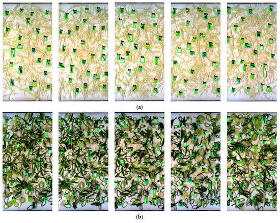Detection of unrecognized FMs by the YOLOv7x model: (a) Cabbage; (b) Green onion.