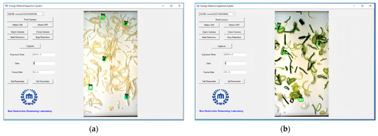 To facilitate the practical deployment of the YOLOv7x model for real-time FM detection in fresh-cut vegetables, a user-friendly software interface was developed, seamlessly integrated with the conveyor system and synchronized sensing units. As depicted in Figure 10, the software interface was designed to be intuitive and efficient, allowing operators to control and monitor the detection process easily. Key parameters, such as the exposure time, gain, and camera frame rate, were stabilized to ensure a consistent detection performance across different operating conditions.