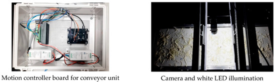 The software was equipped with several critical functionalities to enhance the user experience. The “Find Camera” button allowed the system to verify camera connectivity, ensuring the detection process could begin without technical issues. Upon activation of the motor and opening of the camera, the conveyor belt was synchronized with the camera’s operation, enabling smooth real-time detection. The system displayed a field of view (FOV) of 15 × 30 cm, where the detection process occurred at a rapid speed of 0.025 s per frame, ensuring that even high-throughput operations could be handled effectively. To mitigate potential interference from external light sources, the detection setup, illustrated in Figure 11, included strategically placed white LED lights and cameras within a controlled darkroom environment. This setup ensured that the detection was not compromised by varying light conditions, a critical consideration in ensuring consistent performance in diverse processing environments.