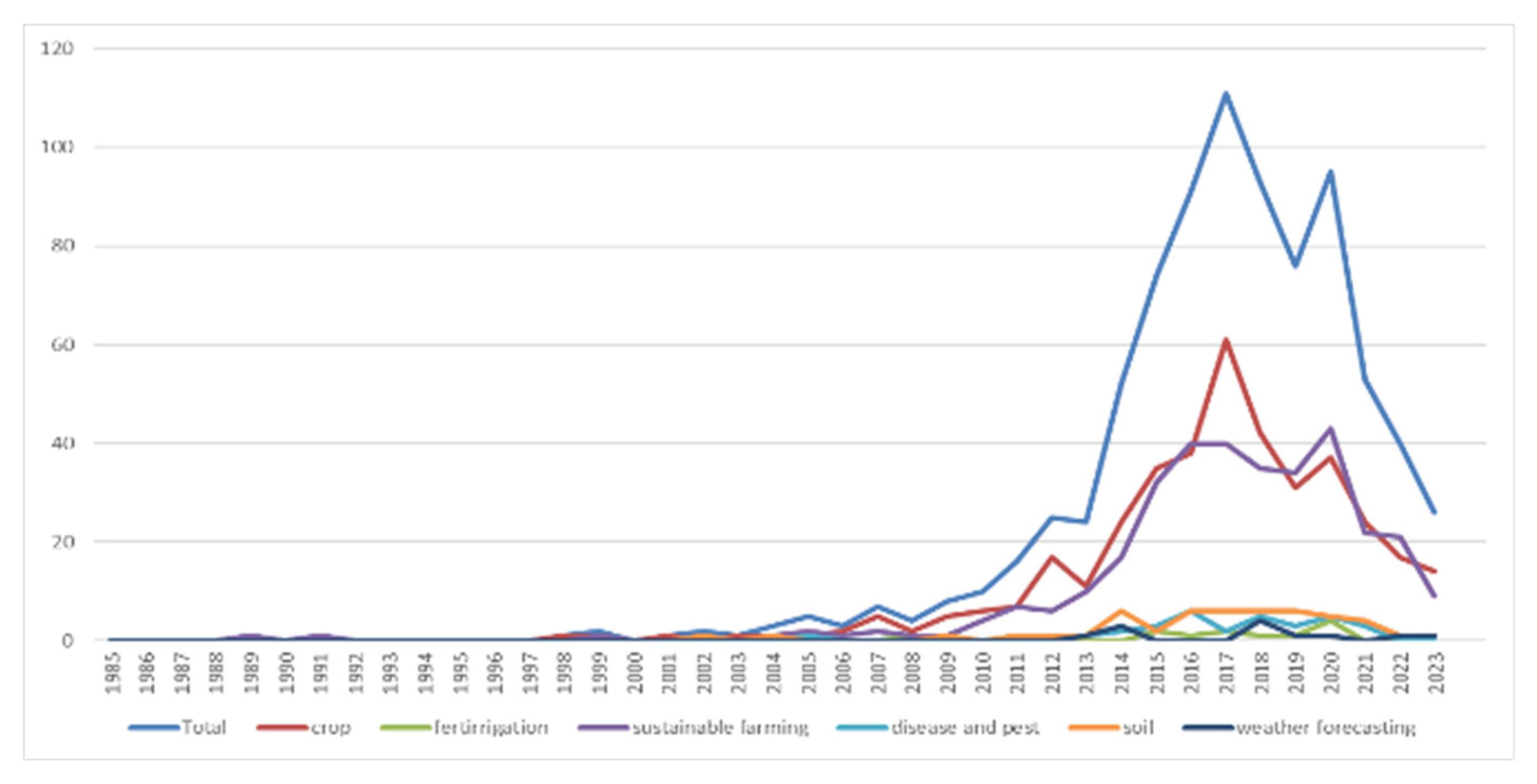 • The evaluation on time axis between the general domain of AI in agriculture and the specific sub-domains defined by the current classifier;