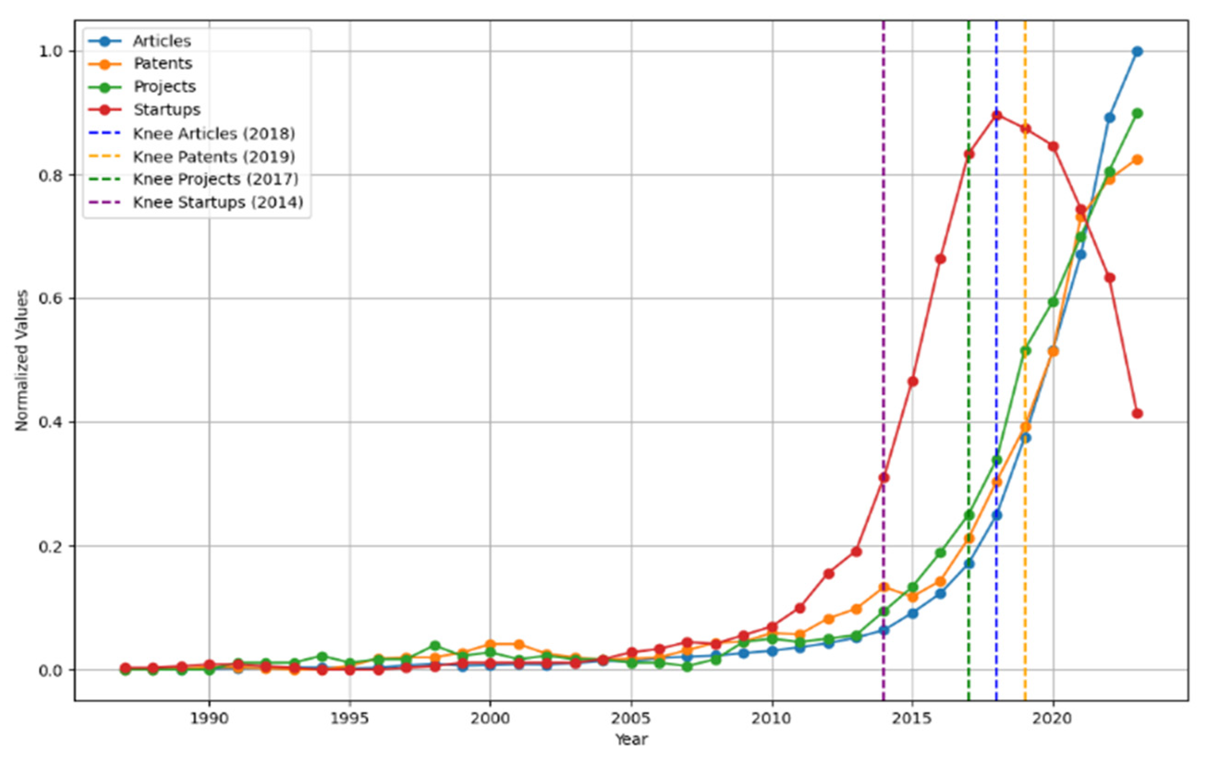 In the continuation of the study, we focused on defining the data structure by selecting the dimensions necessary for creating time series, particularly the temporal dimension and the measure under analysis. This resulted in a series of frequencies representing the number of articles, projects, patents, and start-ups that were extracted from four databases using a searching method that describes the intersection of the AI and agriculture domains. The resulting time series, corresponding to each stage of the innovation lifecycle, were smoothed and min max normalized to mitigate the cyclic effects caused by external events, or, in the case of projects, the ending of one program and the starting of another, as well as to make the series comparable. The next step involved determining the knee points, from which each series experiences a sudden change, to gain an initial understanding of the order of processes in the innovation cycle and whether it aligns with the formulated hypotheses. The second derivative approach was used to identify the points of maximum curvature. The knee point is where the curve changes from a gradual to a steep slope, indicating exponential growth.