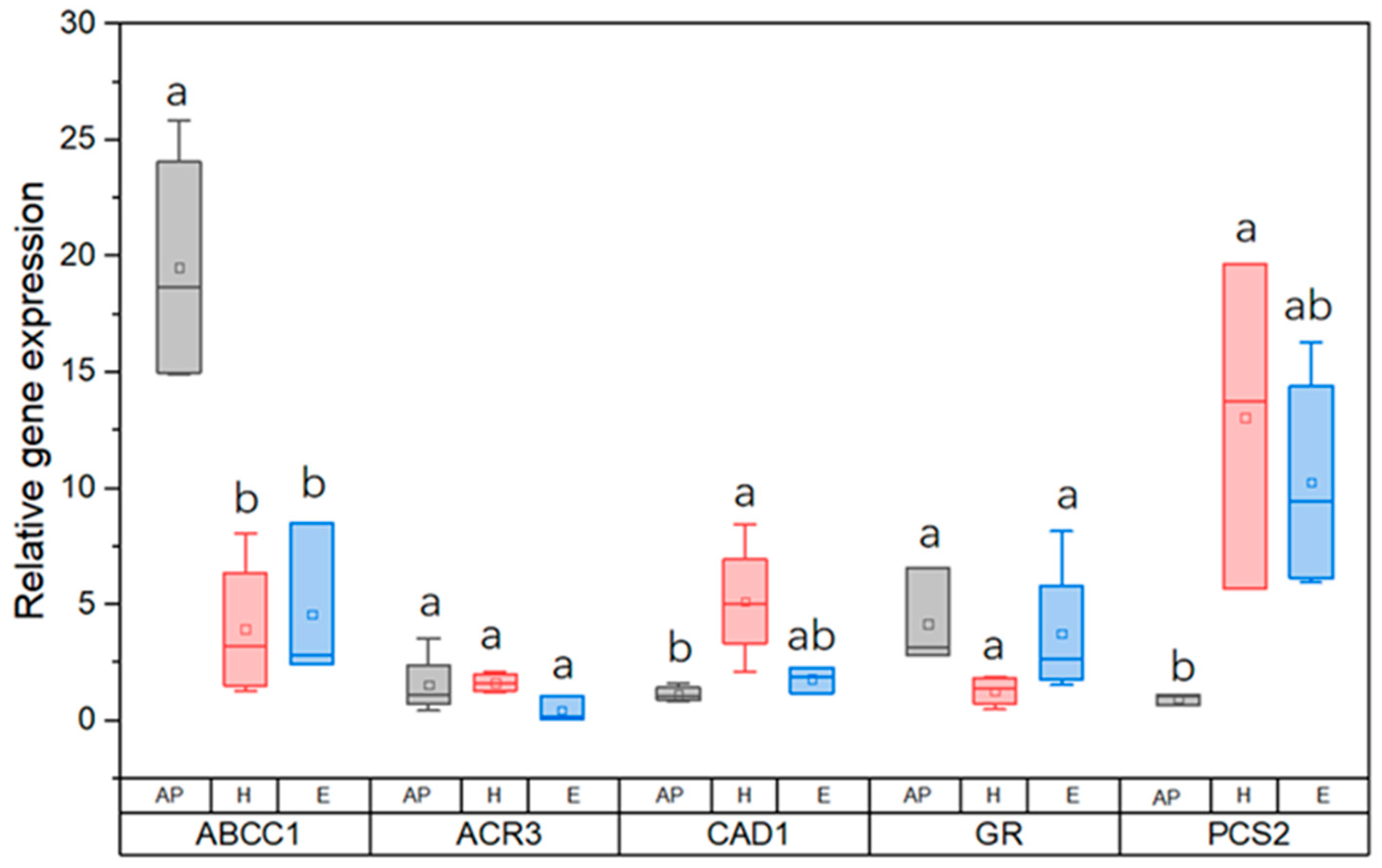 - Park, J.; Song, W.-Y.; Ko, D.; Eom, Y.; Hansen, T.H.; Schiller, M.; Lee, T.G.; Martinoia, E.; Lee, Y. The Phytochelatin Transporters AtABCC1 and AtABCC2 Mediate Tolerance to Cadmium and Mercury. Plant J. 2012, 69, 278–288. [Google Scholar] [CrossRef]