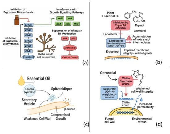 Antifungal targets of plant-derived essential oils (EOs). (a) Multi-target blockade of ergosterol biosynthesis (ERG11, ERG3, ERG6, ERG2, ERG5, ERG1) coupled to interference with the velB/vea/laeA/fluG/Mtfa signaling module and down-regulation of the aflR/aflS activators, collectively inhibiting hyphal growth and aflatoxin B1 production. (b) Phenolic monoterpenes thymol and carvacrol inhibit lanosterol 14α-demethylase (ERG11/CYP51), causing lanosterol accumulation, toxic sterol build-up and loss of membrane integrity. (c) EO exposure prevents delivery of glucan synthase–containing secretory vesicles addressed to the fungal membrane, depleting β-glucan at the hyphal tip and weakening the cell wall. (d) The aldehyde citronellal binds chitin synthase (CHS), blocks incorporation of UDP-N-acetyl-glucosamine into nascent chitin chains and increases wall permeability, ultimately promoting osmotic stress and lysis. Together, these mechanisms highlight the antifungal potential of EOs to compromise fungal viability by simultaneously disrupting membrane sterol homeostasis, cell wall polysaccharide synthesis.