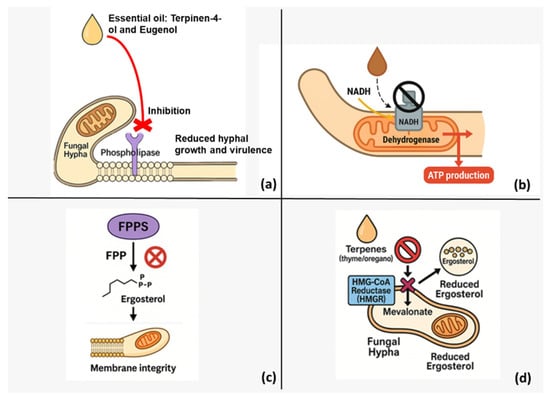 Multifaceted antifungal mechanisms of plant-derived essential oils (EOs). (a) Monoterpenoids terpinen-4-ol and eugenol bind to membrane-embedded fungal phospholipases, blocking phospholipid turnover and thereby weakening the cell wall, arresting hyphal extension and attenuating virulence. (b) EO constituents inhibit mitochondrial NADH dehydrogenase (Complex I), interrupting electron flow to ubiquinone, collapsing the proton-motive force and lowering ATP output. (c) Targeting farnesyl pyrophosphate synthase (FPPS) reduces the cellular pool of farnesyl pyrophosphate, limiting downstream sterol (ergosterol) synthesis and compromising plasma-membrane integrity. (d) Terpene-rich EOs from thyme and oregano inhibit HMG-CoA reductase (HMGR)—the rate-limiting enzyme of the mevalonate pathway—decreasing mevalonate flux and further depleting ergosterol. Collectively, these parallel disruptions of lipid metabolism and respiratory energy production undermine fungal growth and viability.