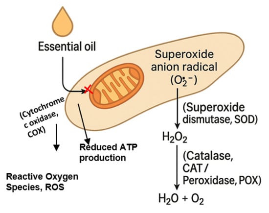 One of the central antifungal mechanisms of EOs is the induction of oxidative stress through excessive generation of reactive oxygen species (ROS) [82]. When EO constituents penetrate fungal membranes, phenolic and terpene compounds disrupt mitochondrial cytochrome c oxidase activity, leading to electron leakage and one-electron reduction of oxygen to superoxide radicals (O2·−) [83].