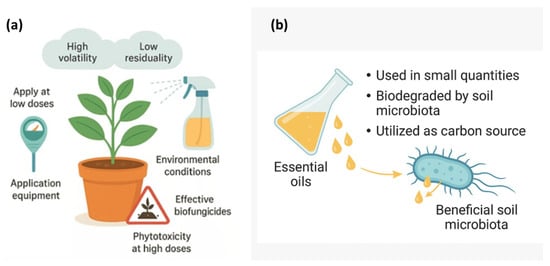 Safe application and environmental compatibility of essential oils as biofungicides. (a) Appropriate use of essential oils on plants under field conditions considering volatility, residuality, dosage, equipment, and environmental factors. (b) Interaction between essential oils and beneficial soil microbiota showing their biodegradation and utilization as a carbon source.