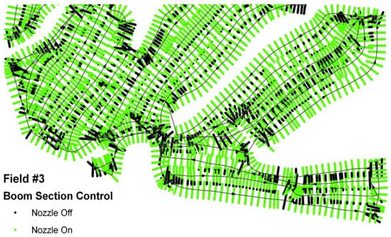 Agricultural spraying is also intrinsically linked to the development of logics for spray switching, i.e., for the on and off switching of nozzles. Besides optimized area coverage path planning, a second strategy for efficient and resource-saving spraying is to suitably switch on and off individual nozzles for areas already sprayed, and to vary nozzle flow rates of individual nozzles along turn maneuvers to compensate for different traveling velocities of different sections of the boom bar. The name for this is Automatic Section Control (ASC) or Automatic Boom Section Control []. ASC is a long-standing trend for spray applications in agriculture [].