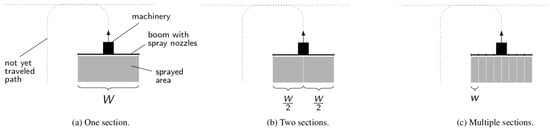 Typically, uniform spray application over the entire field area is desired. Nevertheless, it is mentioned that there exist alternative scenarios such as spot spraying or banding, where only specific spots or bands of the field area are meant to be sprayed [,,]. However, the topic for the remainder of this paper is uniform spraying.