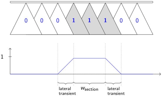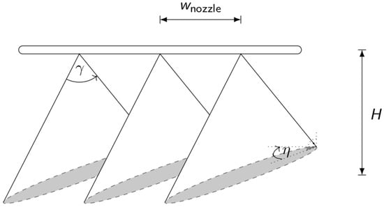 Nevertheless, the simplification of assuming constant spray along this section despite an actual lateral transient according to Figure 5 is explicitly stressed. In Figure 5, three nozzles are illustratively treated as one section of width with 100% overlap, where the lateral spray distance on the ground is twice the nozzle spacing [].