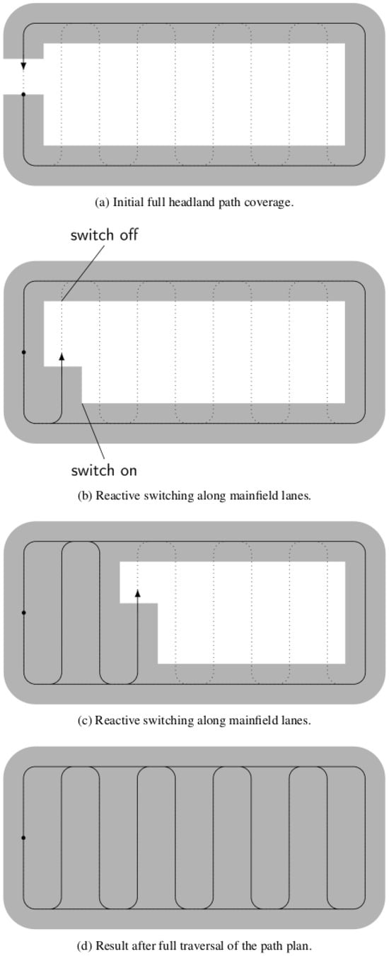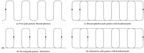 - Boustrophedon: Boustrophedon paths, whose name is derived from Ancient Greek for “like the ox turns”, represents the standard pattern for area coverage applications and agricultural real-world praxis. It is characterized by a full headland coverage before mainfield lanes are traversed in a meandering pattern. See Figure 8a,c.