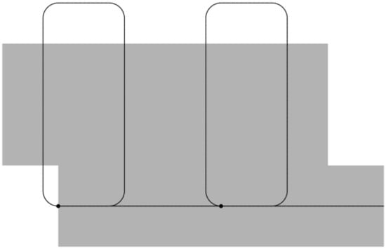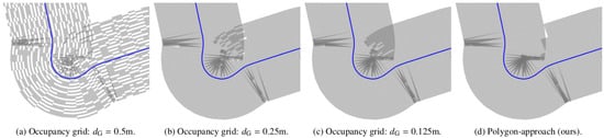 Second, one may switch off, , if there is an overlap with an already sprayed area or with an area that will be sprayed later within an predictive spraying scheme. The standard approach for this is an occupancy grid-based approach [,]. The advantage of this approach is computational simplicity. The disadvantage is that at least 1 hyperparameter needs to be set, which results in either spray gaps or spray overlaps, as Figure 14 demonstrates. Therefore, an alternative polygon-based approach is employed throughout the remainder of this paper. Here, (i) a polygon is recursively constructed from the area that has been sprayed so far, before (ii) at area coverage runtime for a potential spray section cell candidate it is evaluated whether it is an element of the polygon representing already sprayed area or not. If the centroid of a cell candidate is not yet element of the polygon the cell is sprayed and the polygon is augmented. For computational efficiency and to keep a constant size, the polygon is recursively updated by considering only the last 10 sampling spaces. This polygon approach is only applied along the headland path area.