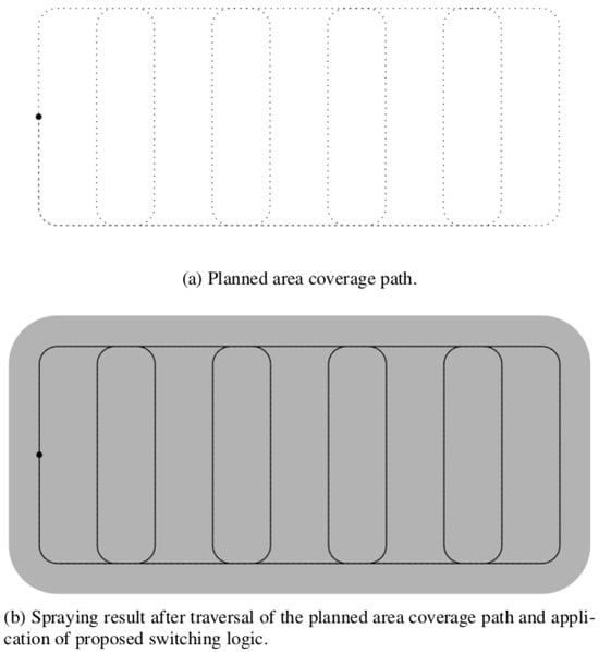 Agricultural spraying is intrinsically linked to area coverage path planning [,,,,]. In order to achieve uniform spraying and subject to the constraint of a given working width, an area coverage path plan is desired that avoids area coverage gaps and overlaps, while minimizing area coverage pathlength.