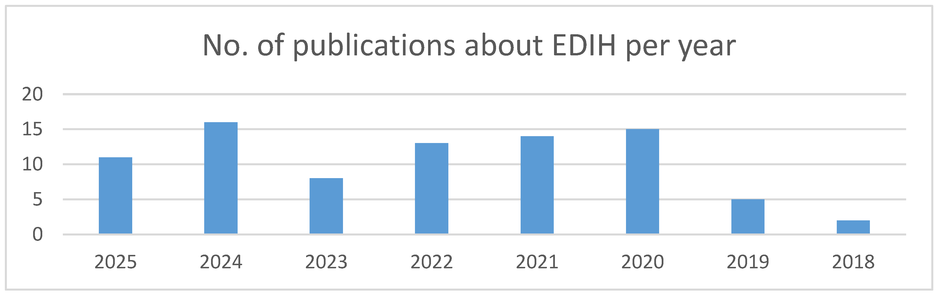 - Chronologically organized in order to assess alignment between their publication date and key stages in the development of EDIHs. Articles from the period 2018–2023 when DIHs were developed through the Horizon research and innovation program, when the concept and EDIH approaches were piloted, and methodologies for EDIH development and services were discussed for their contributions to the testing of theories, frameworks, methodologies, ontologies, and case studies, with the note that conclusions were often conceptual, optimistic, lacking extensive empirical grounding and needing revalidation (see Section 4). However, empirical articles based on the S3P database of DIHs and surveys of DIHs existing at the time were marked as outdated, as they relied on the original DIH concepts and flexibility in terms of service definitions, dating back to a period before the first official DEP financing call when many more DIHs existed and did not necessarily respect the rigors set by the EDIH financing calls. Articles published between 2024 and 2025 were considered most relevant in terms of their empirical results, as they coincided with the first implementation phase of the EDIH initiative and could draw on Digital Europe Programme implementation results.