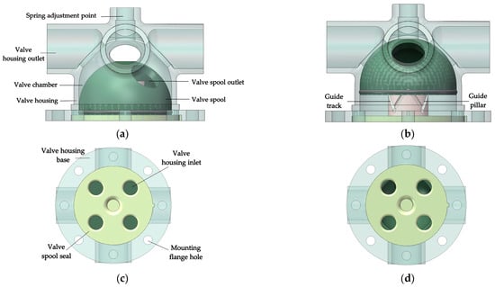 Figure 1. Physical structure diagram of Hydraulic Actuated Irrigation Control Valve (HAICV): (a) valve housing; (b) valve base; (c) valve spool; (d) guide pillar.