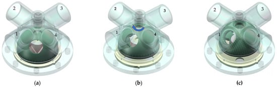Figure 3. Schematic diagram of the HAICV opening process: (a) closed state; (b) raised state; (c) open state. The diagram is labeled according to the outlet connection sequence, with arrows indicating the direction of valve spool rotation.
