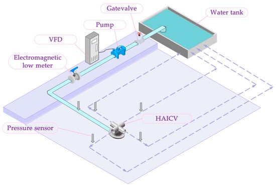 Following the completion of the first batch of HAICV products, formal experimentation commenced in June 2024 at an experimental park in Urumqi, Xinjiang Uygur Autonomous Region. Figure 4 shows a schematic diagram of the hydraulic characteristic testing setup, created using Microsoft Office PowerPoint [38]. This system is a closed-loop circulation setup, primarily consisting of a water tank, a variable-frequency centrifugal pump, circulation piping, and the valve under test. During testing, the pump supplies water to the pipeline. The water flow rate in the pipeline is regulated by adjusting the pump speed via a variable frequency drive (VFD). Water from the tank circulates through the system via the pump unit, passing sequentially through an electromagnetic flow meter, an inlet control valve, the valve under test, and an outlet control valve, before returning to the tank to form a closed loop. To ensure the accuracy of flow rate and pressure measurements, the flow meter is installed at a distance of 20D from the test valve. Pressure sensors are mounted at 10D upstream and 10D downstream of the test valve to measure the pressure before and after the valve within the test section, respectively. To prevent the parallel pipelines downstream of the valve from altering the pressure conditions, four separate individual circuits were employed and tested sequentially.