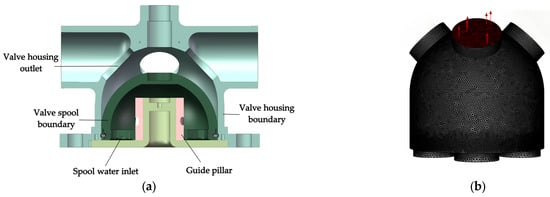 Figure 5a shows the central cross-sectional structure of the HAICV, which also serves as the reference plane for subsequent flow field analysis. It can be clearly seen from the figure that the internal structure of the HAICV body is divided into two main regions based on function and motion characteristics: the internal flow passage region defined by the valve spool boundary, and the external cavity region formed by the valve housing boundary. During the opening process of the HAICV, these two regions exhibit distinctly different variation characteristics. Due to its fixed structure, the shape and flow area of the internal flow passage within the valve spool remain constant throughout the opening and closing process, ensuring the stability of water flow through the spool. In contrast, the cavity space defined by the valve housing boundary continuously changes as the valve spool rises. The upward movement of the valve spool continuously compresses the top cavity, while the lower flow space correspondingly expands. This complementary relationship between the upper and lower spaces directly influences the distribution and evolution of the flow field within the valve body and provides important structural insights for understanding the dynamic hydraulic characteristics of the HAICV.
