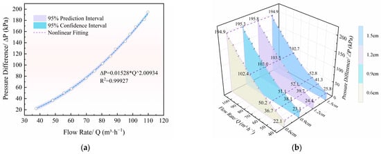 Prior to data acquisition, all system valves were opened and the variable-frequency pump was activated to ensure the entire pipeline was fully primed. The flow rate within the pipeline was adjusted by setting different frequencies on the VFD. For each test point, the system was observed for at least 10 s. A steady state was considered achieved if the variation in each measured quantity did not exceed 1.2% (calculated as the ratio of the difference between the maximum and minimum readings to the average value). The corresponding pressure and flow rate readings were recorded only when a steady state was attained and the flow exhibited no fluctuations. Data was acquired at a sampling frequency of 100 Hz, meaning 100 data points were collected per second. Each test group was repeated ten times to eliminate random errors in the results. These data were used to set the inlet pressure boundary condition for the subsequent numerical simulations and to validate the simulation accuracy.