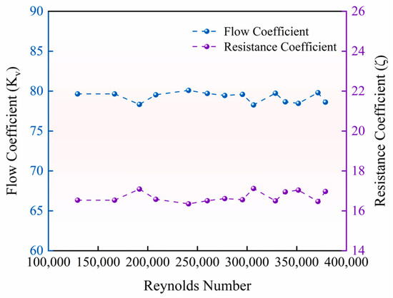 Due to the inherent fluctuation characteristics of the HAICV’s flow coefficient and resistance coefficient within a certain range, it is challenging to verify the accuracy of the measurement results using conventional methods. Therefore, this study employs uncertainty analysis [43] to evaluate the measurement results. Depending on the method of data acquisition, the sources of data uncertainty can be categorized into Type A and Type B. Type A uncertainty is calculated statistically through repeated measurements, while Type B uncertainty is based on other sources of information, including the calibration data and acquisition accuracy of the experimental instruments. It is evident that a solitary evaluation method is inadequate in accurately reflecting the precision of measurement outcomes. Consequently, a multifaceted evaluation approach is deemed more suitable. To illustrate this, the flow coefficient is selected as the exemplar. The Type A relative uncertainty, uArel (Kv) is calculated using Equations (3)–(6). In a similar manner, the Type A relative uncertainty for the HAICV’s resistance coefficient, uArel (ζ), can be obtained.