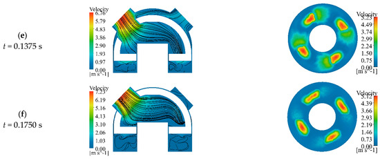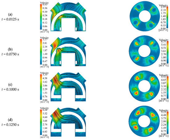 Figure 10. Velocity nephograms of the outlet and bottom cross-section of the valve spool of the HAICV at different time instants. Each subplot represents a cross-sectional cloud map at different moments during the activation process. The left-hand figure shows the velocity contour map at the center cross-section of the outlet combined with the streamline trajectory. The figure on the right displays the velocity contour map at the bottom cross-section of the valve spool.