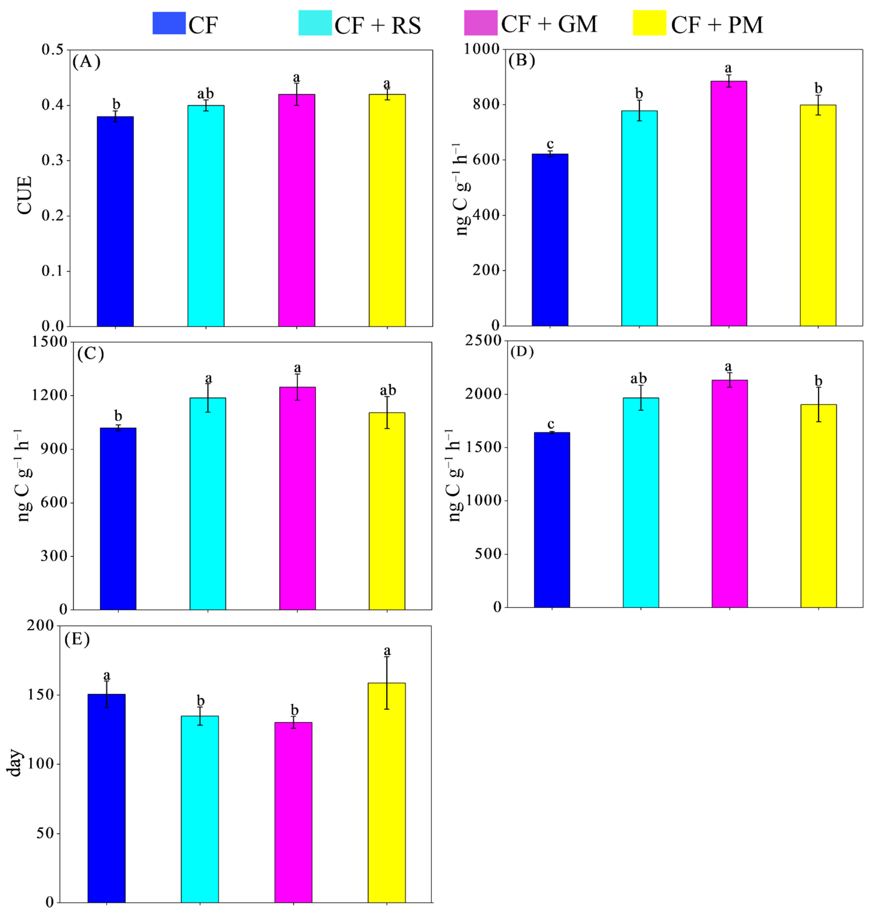 - Ma, L.; Zhu, E.; Jia, J.; Wang, Y.; Kang, E.; Yi, W.; Jiang, Z.; Dai, G.; Feng, X. Does microbial carbon use efficiency differ between particulate and mineral-associated organic matter? Funct. Ecol. 2024, 38, 1510–1522. [Google Scholar] [CrossRef]