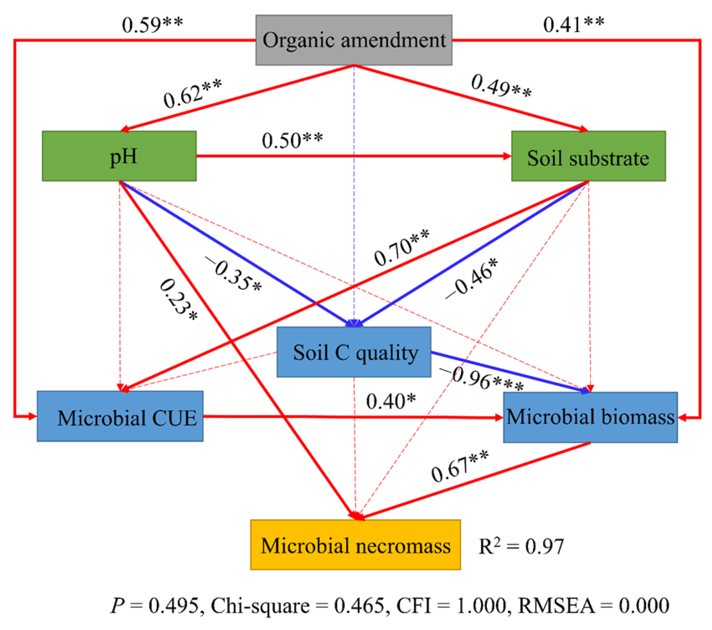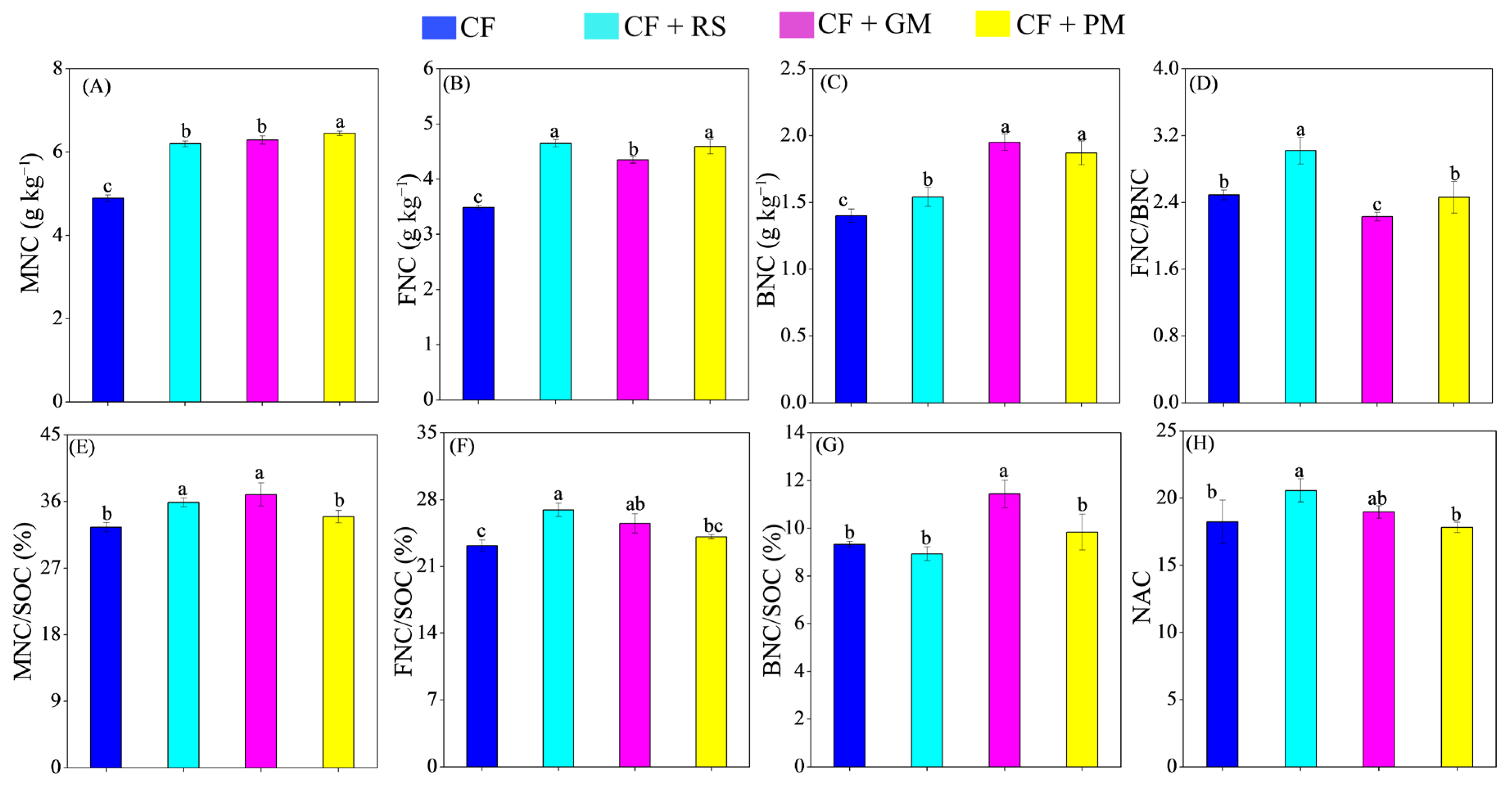 4.3. Effects of Organic Amendments on Microbial Necromass Carbon