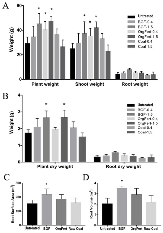 Lettuce growth results. (A) Plant weight, shoot weight, and root weight of lettuce plants in soil with different treatments (BGF, organic fertilizer, and raw coal at 0.4 and 1.5% w/w) in comparison to untreated soils. (B) Plant dry weight and root dry weight of lettuce plants in different treatments (BGF, organic fertilizer, and raw coal at 0.4 and 1.5% w/w). (C) Root surface area of lettuce plants in different treatments (BGF, organic fertilizer, and raw coal at 1.5% w/w). (D) Root volume of lettuce plants in different treatments (BGF, organic fertilizer, and raw coal at 1.5% w/w). n = 5 per treatment. Error bars represent one standard deviation. One-way ANOVA with Dunnett’s post-hoc test was conducted to compare the effects of different treatments on plant growth. The asterisks above the bars indicate significance relative to the control (untreated) at the p < 0.05 level.