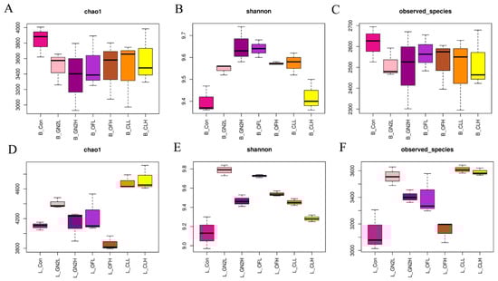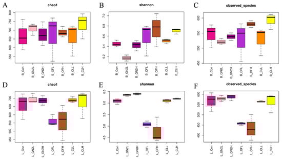 The richness and diversity of bacterial communities. Values are the average of three replicates (n = 3). (A–C) Chao1, Shannon index, and number of observed species in the soil samples before planting. (D–F) Chao1, Shannon index, and number of observed species in the rhizosphere samples after lettuce harvest. B_: soil mix before planting; L_: lettuce rhizosphere after harvested; Con: control (untreated) in dark pink; GN2L: 0.4% BGF in pink; GN2H: 1.5% BGF in dark purple; OFL: 0.4% organic fertilizer in purple; OFH: 1.5% organic fertilizer in brown; CLL: 0.4% coal in orange; CLH: 0.4% coal in yellow; H: high dosage (1.5% w/w); L: low dosage (0.4% w/w). The error bars represent one standard deviation.