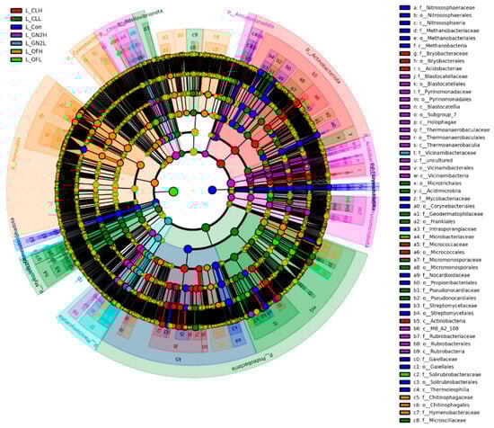 LEfSe cladogram analysis of the bacterial communities in lettuce rhizosphere samples. From inside to outside, rings represent the phylum, class, order, family, and genus taxonomic levels. The different color nodes on the ring represent significant changes in taxonomic composition in the different treatments. L_: lettuce rhizosphere after harvest; Con: control (untreated); CL: coal; GN2: BGF; OF: organic fertilizer; H: high dosage (1.5% w/w); L: low dosage (0.4% w/w).