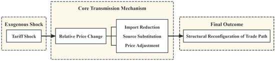 In agricultural trade, path dependence refers to the persistence of historical sourcing patterns due to long-standing trade relationships, logistical infrastructure, and institutional inertia [6,7]. Prior to 2018, China’s soybean imports exhibited a strong dependence on the United States, sustained by stable price competitiveness and established logistical routes. The imposition of retaliatory tariffs disrupted this equilibrium by altering relative prices, thereby dismantling the pre-existing trade path. Building on this conceptual foundation, the study proposes a three-channel analytical framework through which tariff shocks influence agricultural trade. This multi-dimensional mechanism aligns with classical trade adjustment theory [8], where policy shocks trigger re-optimization in sourcing portfolios subject to cost and risk constraints. The conceptual logic can be summarized as follows (Figure 1).