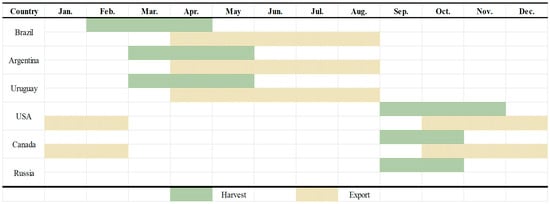 Seasonal harvest and export calendar of major soybean suppliers.