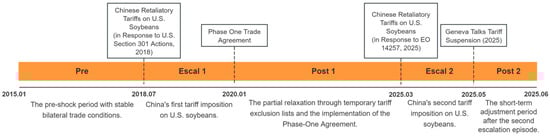 Timeline of U.S.–China soybean tariff episodes (2015–2025).