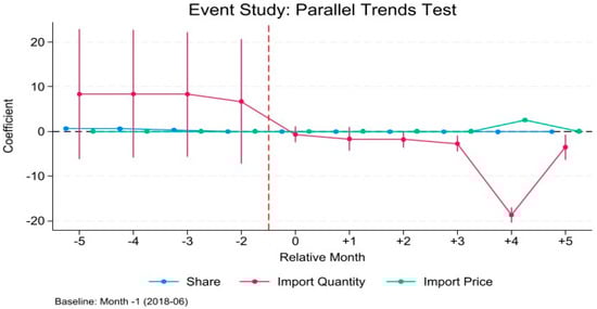 where represents , and , while denotes the logarithmic forms of import volume, import share, and import price, respectively. The specification measures outcomes relative to the policy implementation date (July 2018). The period −1 (one period before the policy intervention) is omitted and serves as the baseline group.